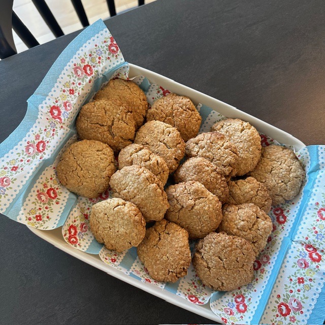 材料はホットケーキミックス、オートミール、バター、こめ油、牛乳、甜菜糖で作りました🌼全部をボールに混ぜて、丸くして焼くだけなので、とっても簡単でした!