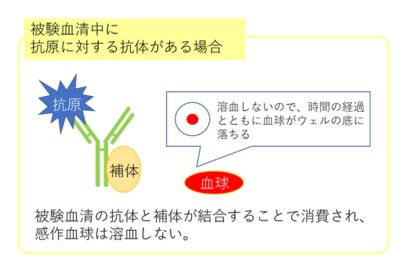 被験血清の倍数希釈列に抗原と補体を加え一定時間反応後感作血球を加えると、被験血清中に抗原に対する抗体がある場合は、その抗原と抗体が結合し形成された抗原抗体複合体と補体が結合することで補体が消費され、感作血球は溶血しません。被験血清中に抗原に対する抗体がない場合は感作血球と補体が結合し、赤血球が溶血します。感作血球を溶血阻止する、被験血清の最高希釈倍率が抗体価となります。