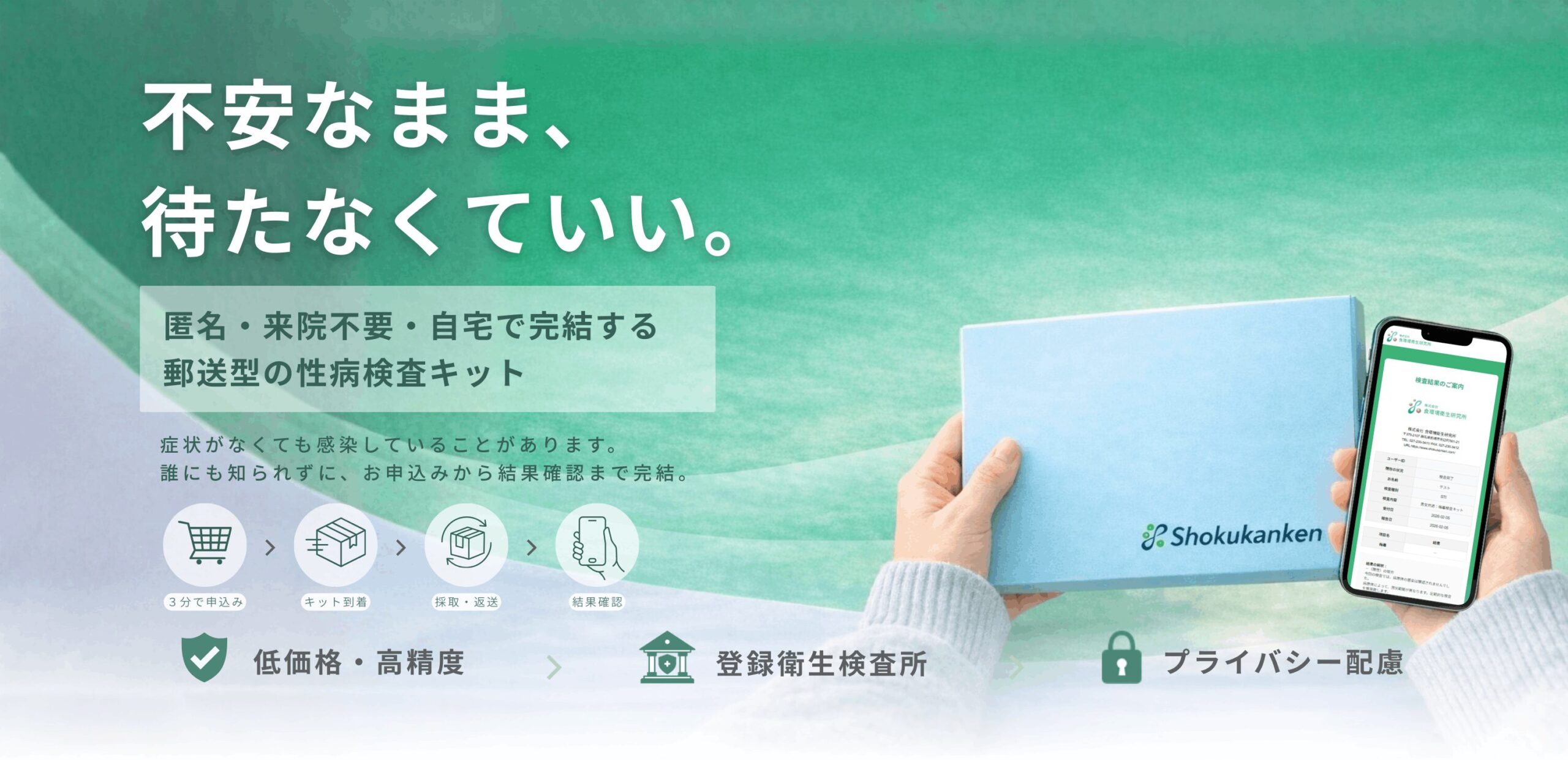 株式会社食環境衛生研究所では、自分で検体を採取して郵送することで検査ができる淋菌・クラミジア検査キットがあるので、病院に行く時間がなかったり、病院に行くことに抵抗がある場合は、まずは郵送検査キットで検査をしてみてもよいでしょう。