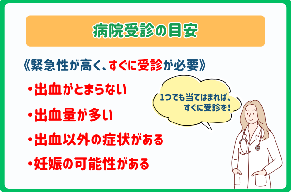 大切なのは、出血があったからといって過度に恐れるのではなく、まずは出血の頻度、量、下腹部痛など他の症状がないかを確認することです。