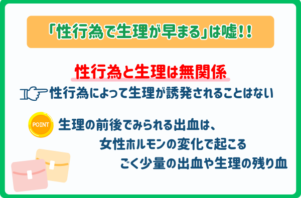 また、「性行為によって生理が誘発される」という噂を聞いたことがある方もいるかもしれませんが、性行為そのものが生理の開始を誘発したり、生理周期をずらしたりすることはありません。