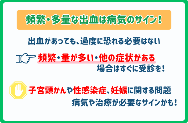出血が頻繁に続く、量が多い、または腹痛や吐き気がある場合は、子宮頸がんや性感染症、妊娠に関する問題など、何らかの治療が必要なサインかもしれません。